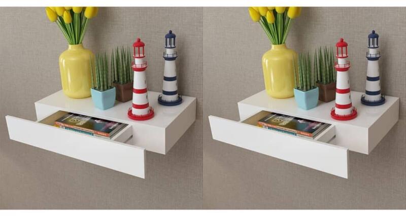 2 db fehér lebegő fali polc fiókkal 48 cm