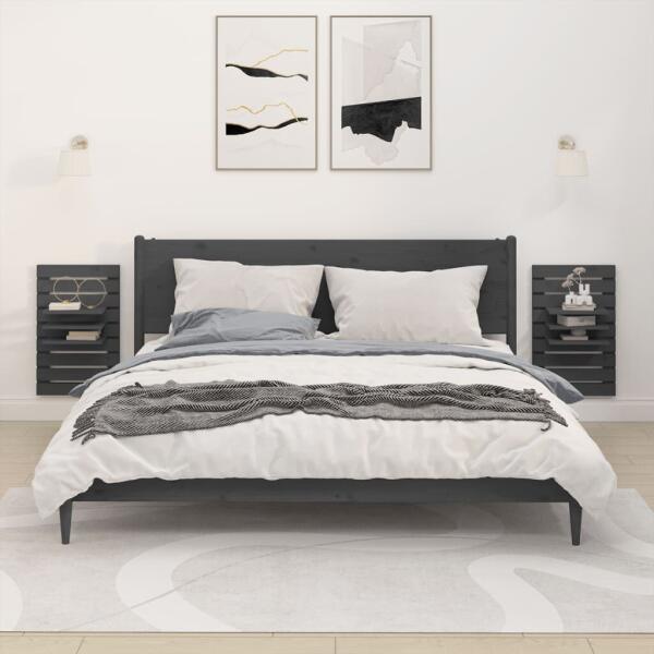 2 db szürke tömör fenyőfa falra szerelhető éjjeli polc