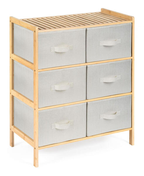 Bambusz Polc 6 Kihúzható Kosárral: Tökéletes Tárolás Otthonába ? Ez a stílusos bambusz polc 6 praktikus, kihúzható textilkosárral rendelkezik, amelyek mindegyike 20 literes űrtartalmú. Ideális megoldás a játékok, ruhák, fürdőszobai kellékek és egyéb apróságok tárolására. A természetes bambusz anyagnak köszönhetően elegáns és időtálló darab, amely bármilyen helyiségbe illeszkedik. Főbb jellemzők:Természetes bambusz: Tartós, környezetbarát és esztétikus. 6 db kihúzható textilkosár: Mindegyik 20 literes (31 x 35 x 19 cm). Könnyű összeszerelés: Gyorsan és egyszerűen összeszerelhető. Modern dizájn: Elegáns megjelenés, amely bármilyen enteriőrbe illeszkedik. Többfunkciós: Alkalmas hálószobába, gyerekszobába, fürdőszobába és más helyiségekbe. Nagy teherbírás: Stabil szerkezet, amely biztonságosan tartja a tárolt tárgyakat. Méretek: 66 x 78,5 x 35 cm A csomag tartalma: 1 db bambusz polc 6 kihúzható textilkosárral A bambusz előnyei: Könnyű, de erős és tartós. Magas nedvességállóság: Ideális fürdőszobába is. Természetes antibakteriális hatás. Tipp: A kosarak összecsukhatóak, így szükség esetén könnyen tárolhatók.