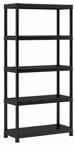 Karbantartásmentes polcállvány sokoldalú használatra teraszon, garázsban, műhelyben és háztartásban, 5 polc, 1 polc teherbírása 55 kg, magas lábak a padló egyszerű tisztítására, magas ellenállás, polccsatlakoztató rendszer. Fekete