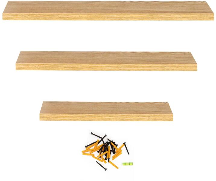 Springos® 3 darabos fali polc szett - Stílus és funkcionalitás egyben! ? Ez a Springos® fali polc szett tökéletes megoldás otthonod dekorálására és a helykihasználás optimalizálására. A szett három különböző méretű polcot tartalmaz, amelyek ideálisak könyvek, növények, fényképek vagy más kedves tárgyak elhelyezésére. Főbb jellemzők: Márka: Springos® Anyag: Fém váz és MDF polclap Szín: Barna Maximális terhelhetőség: 3 kg / polc Könnyű felszerelés: A csomag tartalmaz minden szükséges rögzítőelemet és egy kis vízmértéket a pontos beállításhoz. Méretek:Polc típus Szélesség (cm) Mélység (cm) Vastagság (cm)Kis polc 30 15 1.5Közepes polc 45 15 1.5Nagy polc 60 15 1.5A csomag tartalma: 1 x Kis polc 1 x Közepes polc 1 x Nagy polc 3 x Építőelem 15 x Szög 15 x Tipli 1 x Kis vízmérték Rögzítőelemek méretei: Lapos rúd hossza: 25 cm Lapos rúd magassága: 1 cm Lapos rúd vastagsága: 0,3 cm Rudak hossza: 7,2 cm Rudak átmérője: 0,6 cm Szögek hossza: 4,5 cm, átmérője: 0,4 cm, fej átmérője: 0,9 cm Dübelek hossza: 4 cm, átmérő: 0,6 cm Vízmérték hossza: 4 cm, átmérő: 0,9 cm Fontos: A méreteknél +/- 2% eltérés előfordulhat. Ezek a polcok nem csak praktikusak, de stílusos kiegészítői is lehetnek bármely helyiségnek. ?