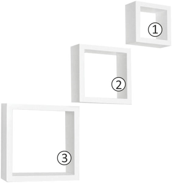 3 polc szett, KVADRO NEW Anyag: fóliázott MDF Szín: fehér Méretek (SzéxMéxMa): 25,4x8,7x25,4 cm, 20,3x8,4x30,3 cm, 15,3x8,4x15,3 cm